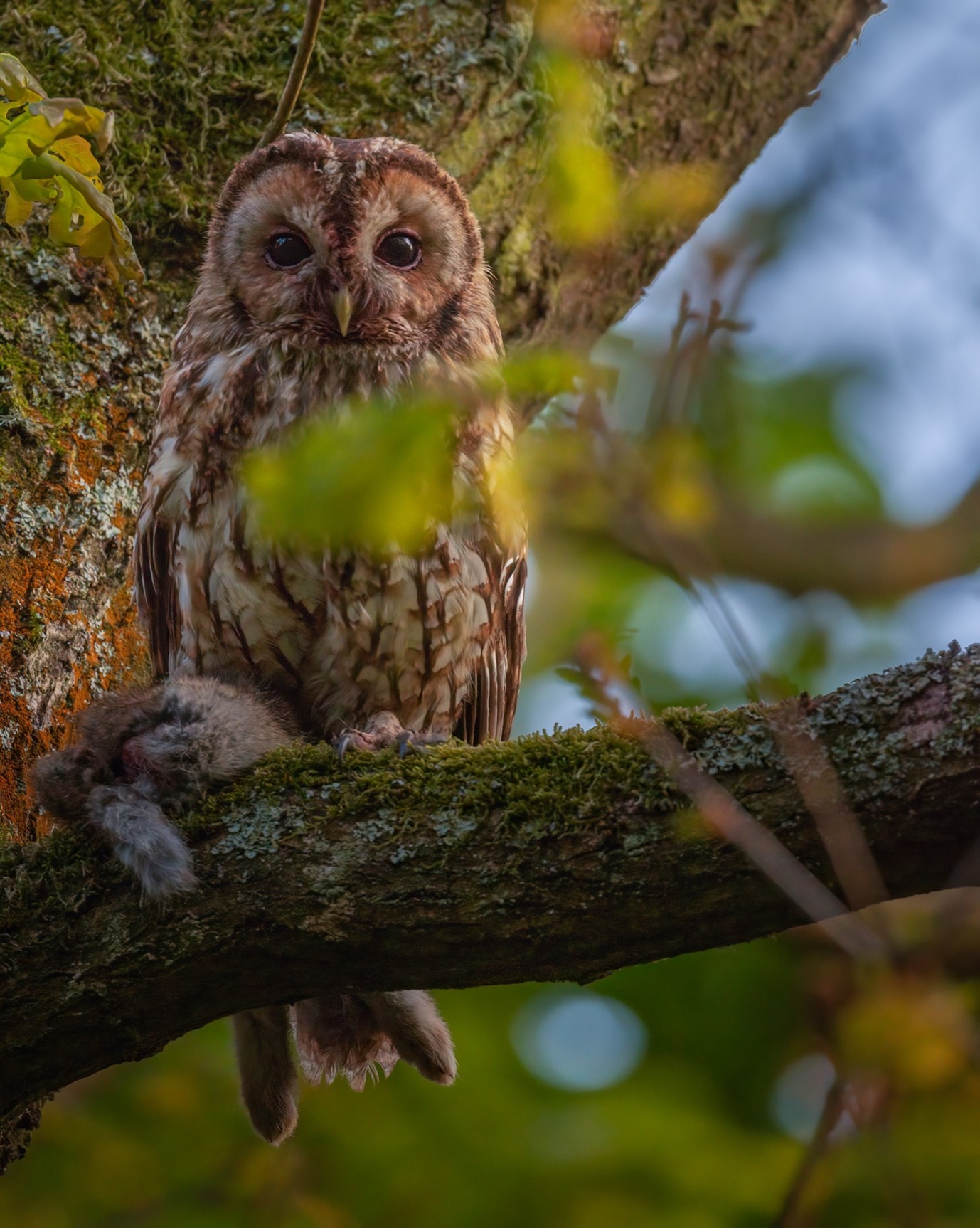 The Tawny is a voracious hunter and along with the Long Eared Owl often give their presence away by the cacophony of song birds that alarm call in great numbers when they are awake. Blackbirds are especially good sentry birds in this respect and if you do hear a number of them upset it may be a Tawny and not the usual cat or fox suspect. They take surprisingly large birds, small mammals and rabbits.