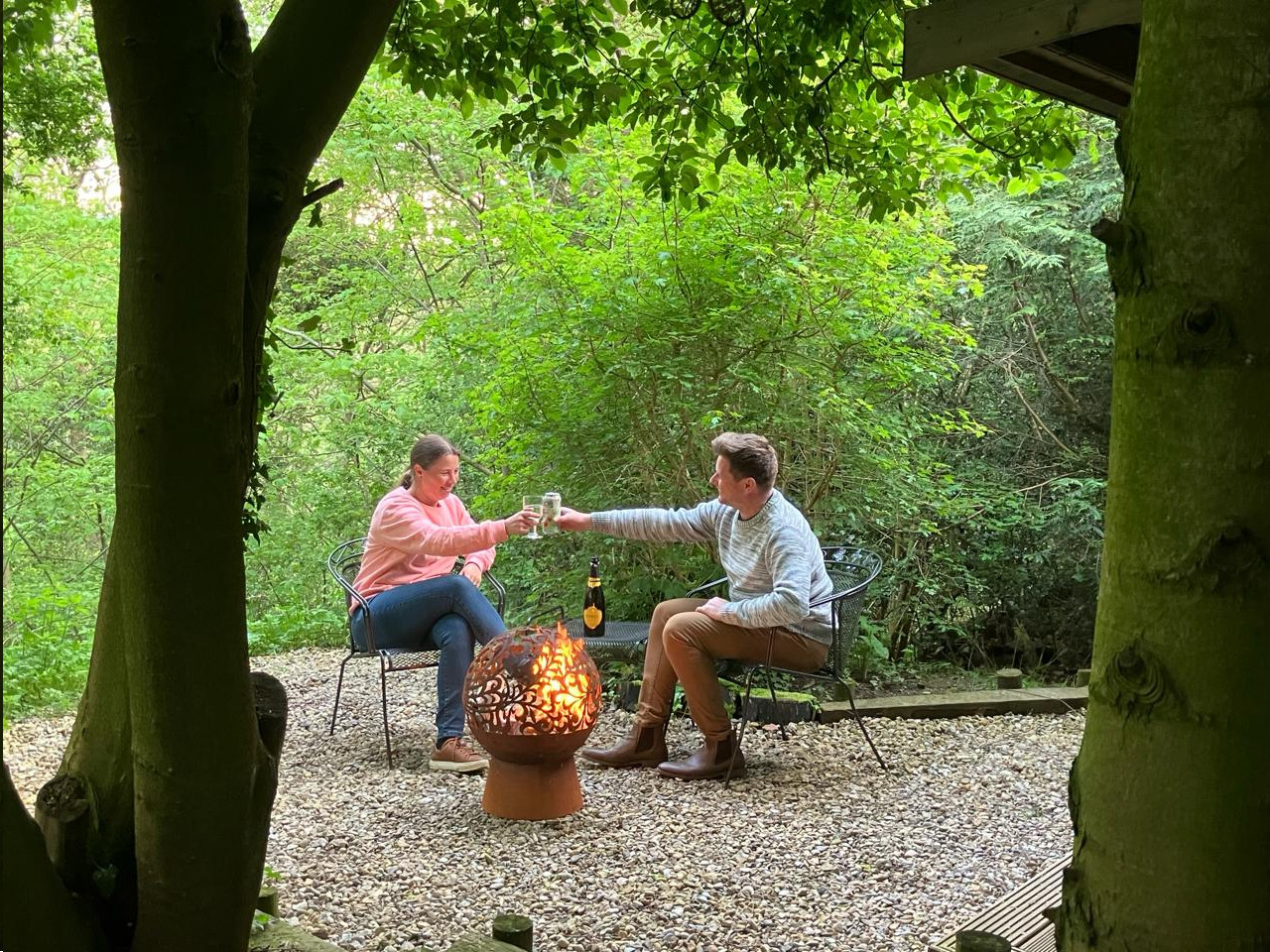 Treetops Cabin is a haven for a couple who want to connect with nature. It stands at the top of the woodland and has outside seating with a fire pit. Treetops cabin is a studio, one  L shaped room with an ensuite shower room. Its about the same length as a Shepherds Hut but twice as wide, with central heating so definitely a luxury ‘glamping’ experience.